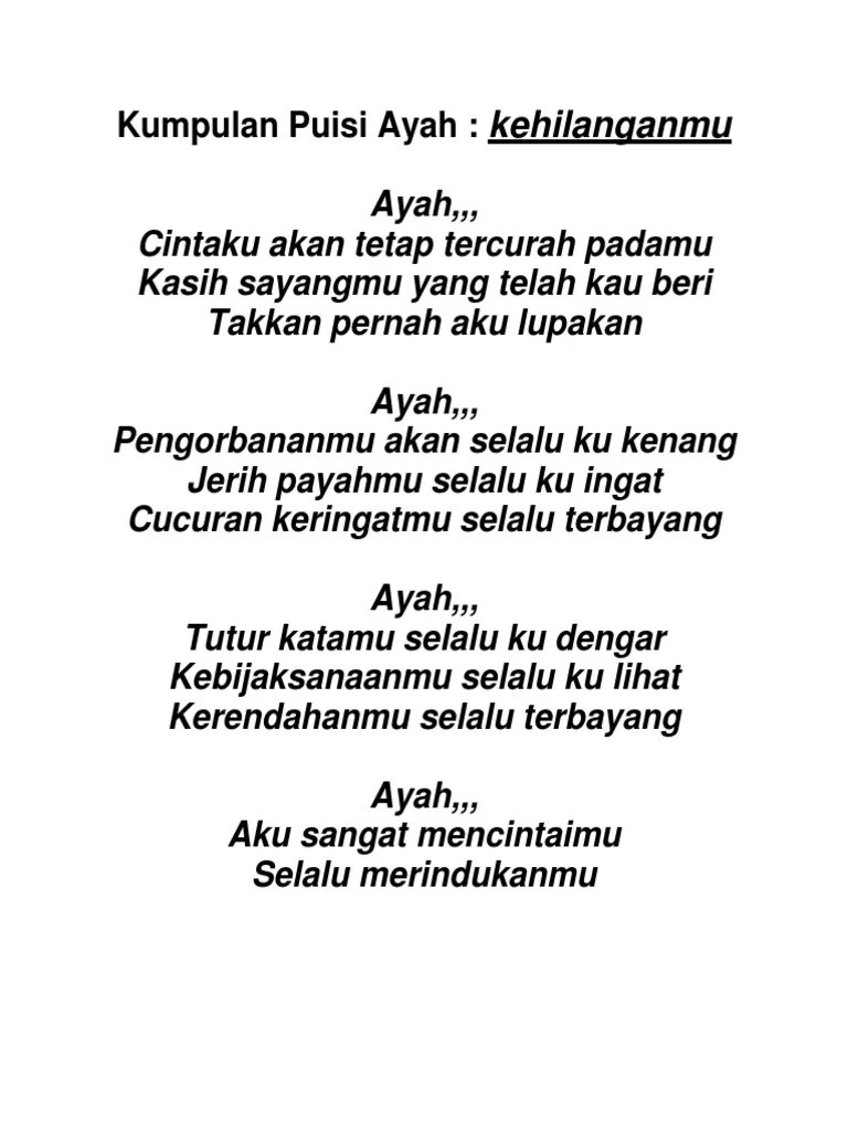 Contoh puisi anak kepada ayah tercinta pendek 3 bait yang bisa . Buatlah puisi 4 bait berstrta judulnya jawab secepatnya. Nah untuk puisi 4 bait yang . 99+ kumpulan contoh puisi pendek, panjang, cinta romantis dan . Puisi ayah singkat 4 bait.