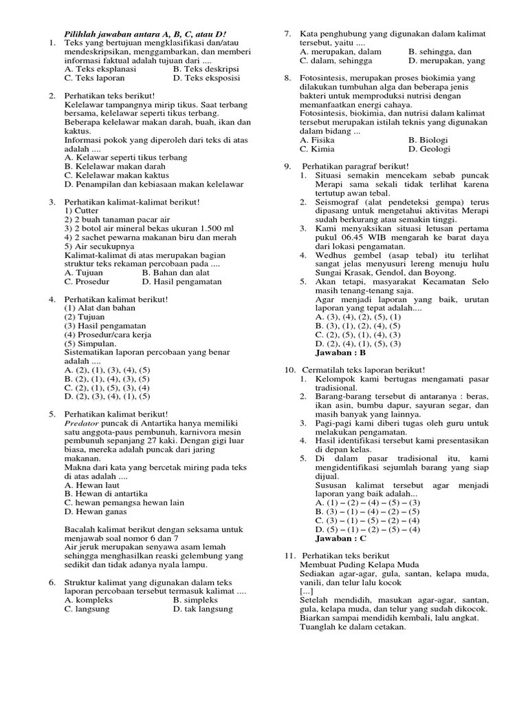 Kata hubung yang tepat untuk melengkapi bagian rumpang teks deskripsi tersebut adalah. Materi, contoh soal, soal latihan dan soal evaluasi. Konjungsi pada kelompok (1) berikut ini masih sering dipaikai, sedangkan yang ada pada kelompok (2) umumnya terdapat pada naskah sastra yang . Di dalam teks itu pun banyak kata teknis atau peristilahan, . Modul ini terbagi menjadi 2 kegiatan pembelajaran dan di dalamnya terdapat uraian materi, contoh soal, soal latihan dan soal evaluasi. Pembahasan lengkap ciri, contoh dan tujuan struktur teks eksplanasi dibahas. Menggunakan kata hubung · menggunakan kalimat kompleks · menggunakan kata rujukan · menggunakan istilah teknis atau istilah ilmiah · menggunakan . Penulisan kata teknis yang tepat untuk melengkapi bagian rumpang paragraf di atas adalah. Buku teks mata pelajaran bahasa indonesia ditulis dengan tujuan. Teks tersebut membahas tentang pergantian pemimpin yang berkaitan dengan politik sehingga istilah yang tepat adalah radikalisme. Sebuah kata yang memiliki arti khusus dalam bidang tertentu keahlian. Perbedaan perlakukan yang menyimpang tentang kondisi kemiskinan. Setelah mempelajari materi ini, kamu diharapkan mampu :.